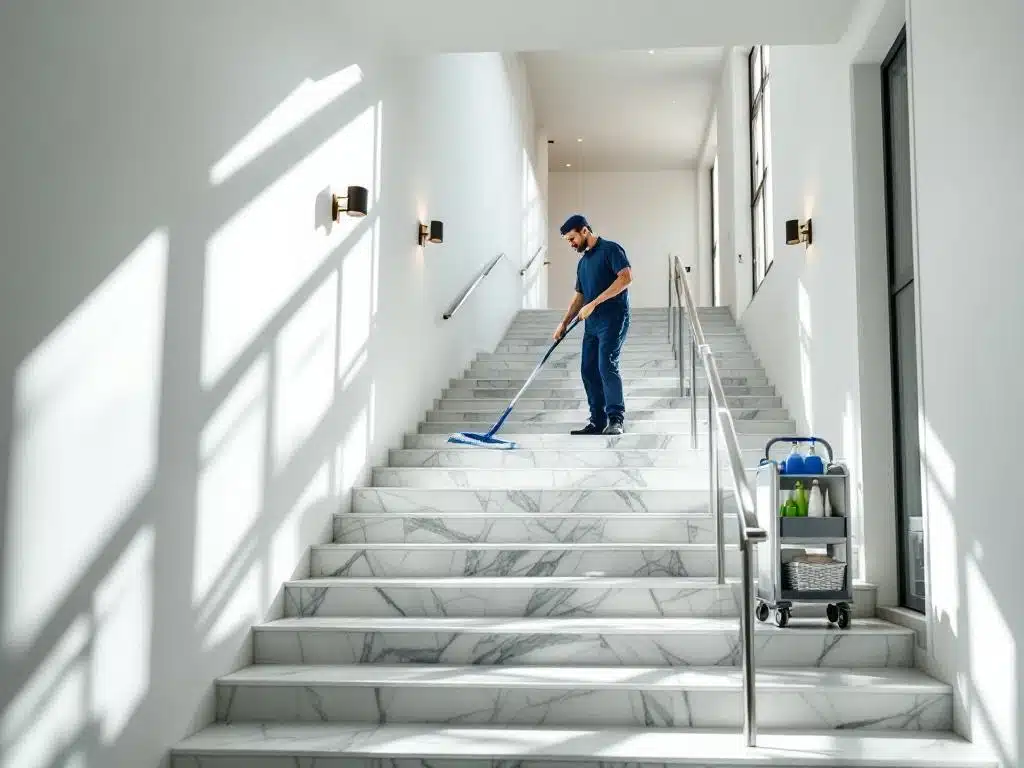 Ammattimainen siivooja moppaa modernia, valoista kerrostalon porraskäytävää. Marmoriportaat ja metallikaiteet kiiltävät skandinaavisessa ympäristössä.